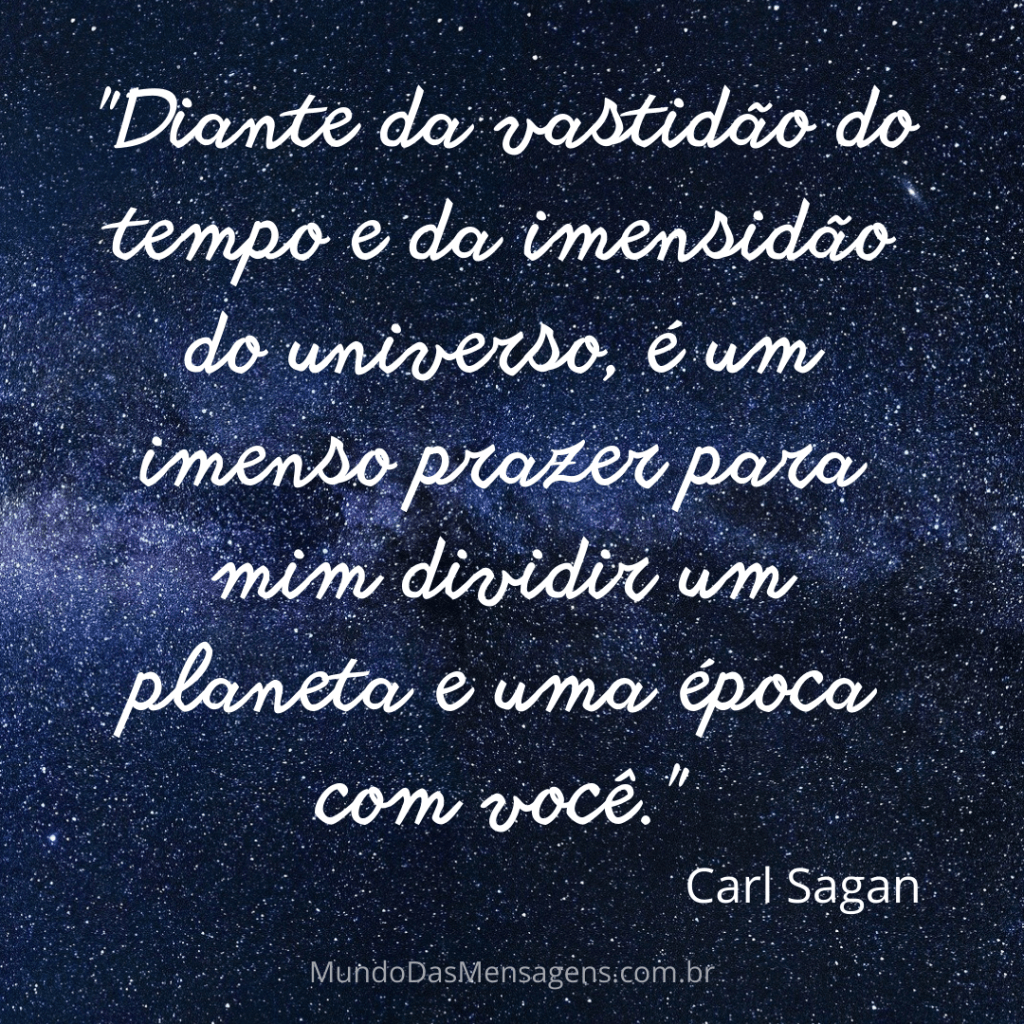“Diante da vastidão do tempo e da imensidão do universo…” “Diante da vastidão do tempo e da imensidão do universo, é um imenso prazer para mim dividir um planeta e uma época com você.” Carl Sagan Compartilhe essa mensagem com alguém especial: Compartilhar no WhatsApp(abre em nova janela) WhatsApp Compartilhar no Facebook(abre em nova janela) Facebook Compartilhar no X(abre em nova janela) X Compartilhar no Pinterest(abre em nova janela) Pinterest Compartilhar no Telegram(abre em nova janela) Telegram Compartilhar no LinkedIn(abre em nova janela) LinkedIn Compartilhar no Tumblr(abre em nova janela) Tumblr Envie um link por e-mail para um amigo(abre em nova janela) E-mail Imprimir(abre em nova janela) Imprimir Curtir Carregando... Relacionado