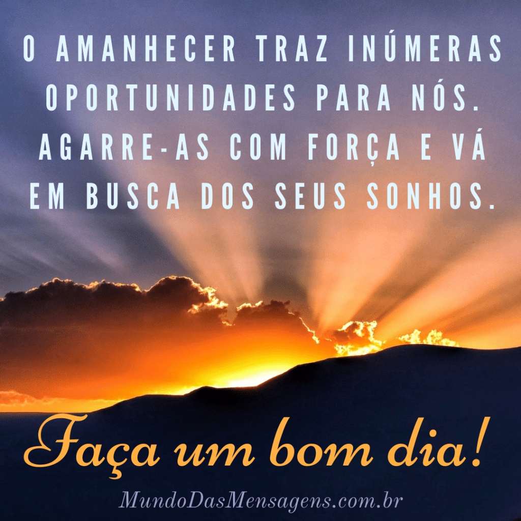 Vá em busca dos seus sonhos. O amanhecer traz inúmeras oportunidades para nós. Agarre-as com força e vá em busca dos seus sonhos. Faça um bom dia! Compartilhe essa mensagem com alguém especial: Clique para compartilhar no WhatsApp(abre em nova janela) WhatsApp Clique para compartilhar no Facebook(abre em nova janela) Facebook Clique para compartilhar no X(abre em nova janela) 18+ Clique para compartilhar no Pinterest(abre em nova janela) Pinterest Clique para compartilhar no Telegram(abre em nova janela) Telegram Clique para compartilhar no LinkedIn(abre em nova janela) LinkedIn Clique para compartilhar no Tumblr(abre em nova janela) Tumblr Clique para enviar um link por e-mail para um amigo(abre em nova janela) E-mail Clique para imprimir(abre em nova janela) Imprimir Curtir Carregando... Relacionado
