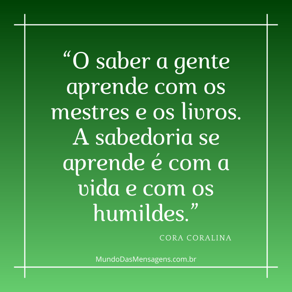 “A sabedoria se aprende é com a vida e com os humildes.” “O saber a gente aprende com os mestres e os livros. A sabedoria se aprende é com a vida e com os humildes.” Cora Coralina Compartilhe essa mensagem com alguém especial: Clique para compartilhar no WhatsApp(abre em nova janela) WhatsApp Clique para compartilhar no Facebook(abre em nova janela) Facebook Clique para compartilhar no X(abre em nova janela) 18+ Clique para compartilhar no Pinterest(abre em nova janela) Pinterest Clique para compartilhar no Telegram(abre em nova janela) Telegram Clique para compartilhar no LinkedIn(abre em nova janela) LinkedIn Clique para compartilhar no Tumblr(abre em nova janela) Tumblr Clique para enviar um link por e-mail para um amigo(abre em nova janela) E-mail Clique para imprimir(abre em nova janela) Imprimir Curtir Carregando... Relacionado