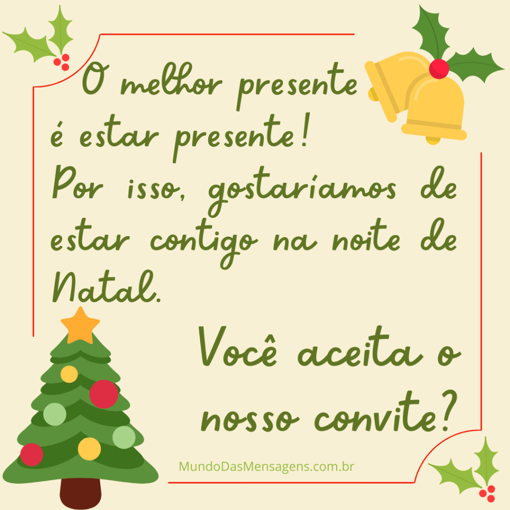 O melhor presente é estar presente! O melhor presente é estar presente!Por isso, gostaríamos de estar contigo na noite de Natal.Você aceita o nosso convite? Compartilhe essa mensagem com alguém especial: Clique para compartilhar no WhatsApp(abre em nova janela) WhatsApp Clique para compartilhar no Facebook(abre em nova janela) Facebook Clique para compartilhar no X(abre em nova janela) 18+ Clique para compartilhar no Pinterest(abre em nova janela) Pinterest Clique para compartilhar no Telegram(abre em nova janela) Telegram Clique para compartilhar no LinkedIn(abre em nova janela) LinkedIn Clique para compartilhar no Tumblr(abre em nova janela) Tumblr Clique para enviar um link por e-mail para um amigo(abre em nova janela) E-mail Clique para imprimir(abre em nova janela) Imprimir Curtir Carregando... Relacionado