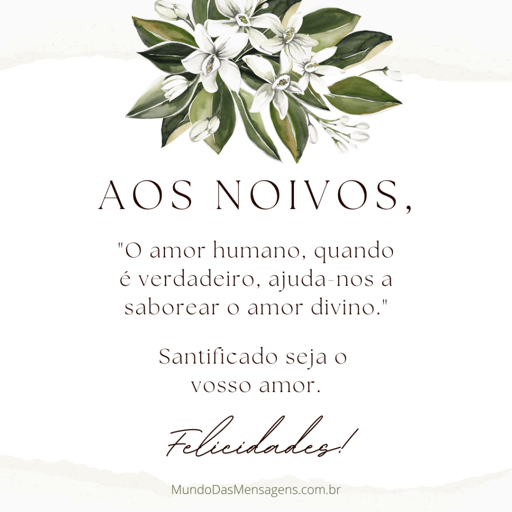Mensagem aos noivos “O amor humano, quando é verdadeiro, ajuda-nos a saborear o amor divino.”Santificado seja o vosso amor. (Essa linda mensagem provém de um emocionante voto de casamento, mas desconhecemos a autoria.) Compartilhe essa mensagem com alguém especial: Clique para compartilhar no WhatsApp(abre em nova janela) WhatsApp Clique para compartilhar no Facebook(abre em nova janela) Facebook Clique para compartilhar no X(abre em nova janela) 18+ Clique para compartilhar no Pinterest(abre em nova janela) Pinterest Clique para compartilhar no Telegram(abre em nova janela) Telegram Clique para compartilhar no LinkedIn(abre em nova janela) LinkedIn Clique para compartilhar no Tumblr(abre em nova janela) Tumblr Clique para enviar um link por e-mail para um amigo(abre em nova janela) E-mail Clique para imprimir(abre em nova janela) Imprimir Curtir Carregando... Relacionado