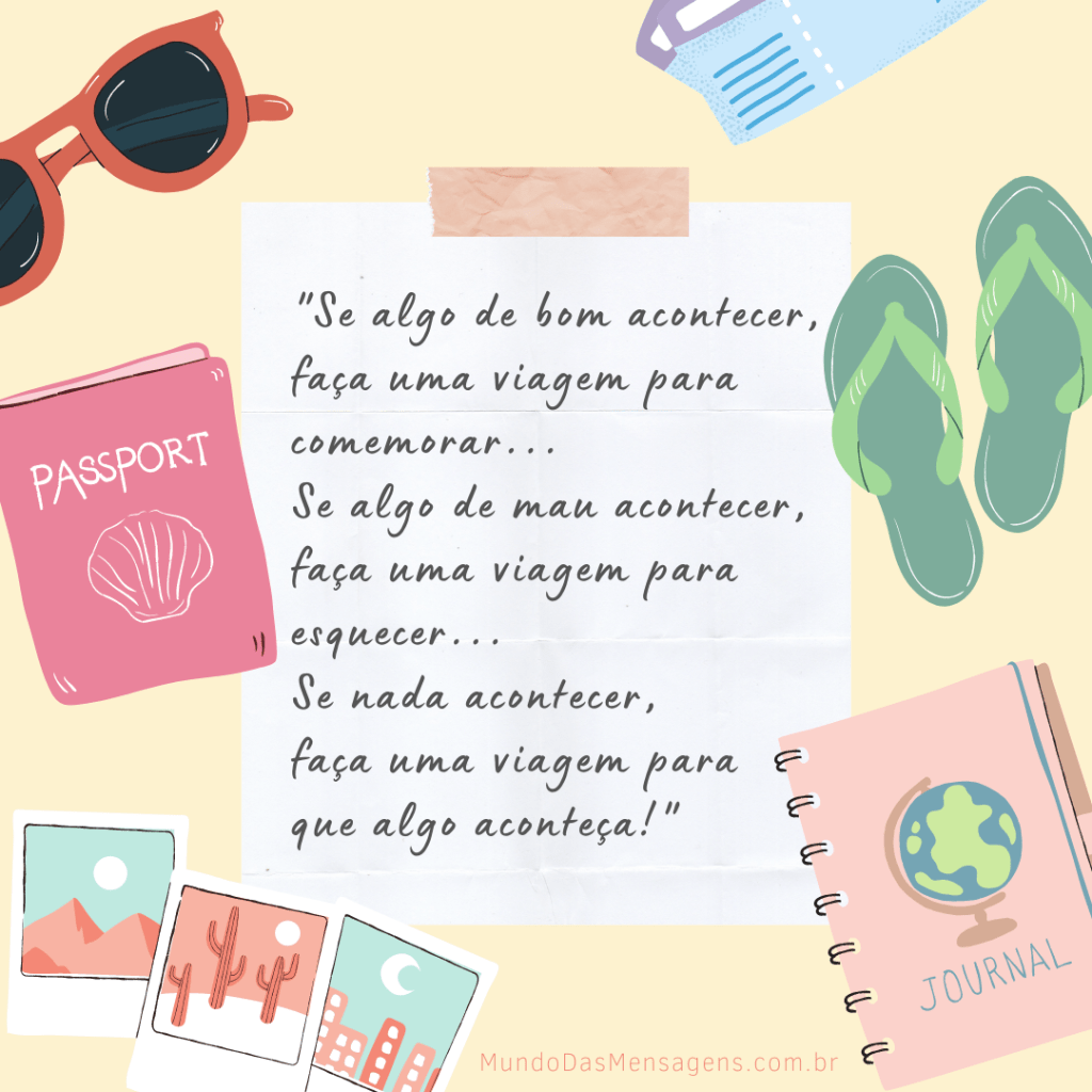 Motivos para viajar “Se algo de bom acontecer, faça uma viagem para comemorar…Se algo de mau acontecer, faça uma viagem para esquecer…Se nada acontecer, faça uma viagem para que algo aconteça!” Compartilhe essa mensagem com alguém especial: Clique para compartilhar no WhatsApp(abre em nova janela) WhatsApp Clique para compartilhar no Facebook(abre em nova janela) Facebook Clique para compartilhar no X(abre em nova janela) 18+ Clique para compartilhar no Pinterest(abre em nova janela) Pinterest Clique para compartilhar no Telegram(abre em nova janela) Telegram Clique para compartilhar no LinkedIn(abre em nova janela) LinkedIn Clique para compartilhar no Tumblr(abre em nova janela) Tumblr Clique para enviar um link por e-mail para um amigo(abre em nova janela) E-mail Clique para imprimir(abre em nova janela) Imprimir Curtir Carregando... Relacionado