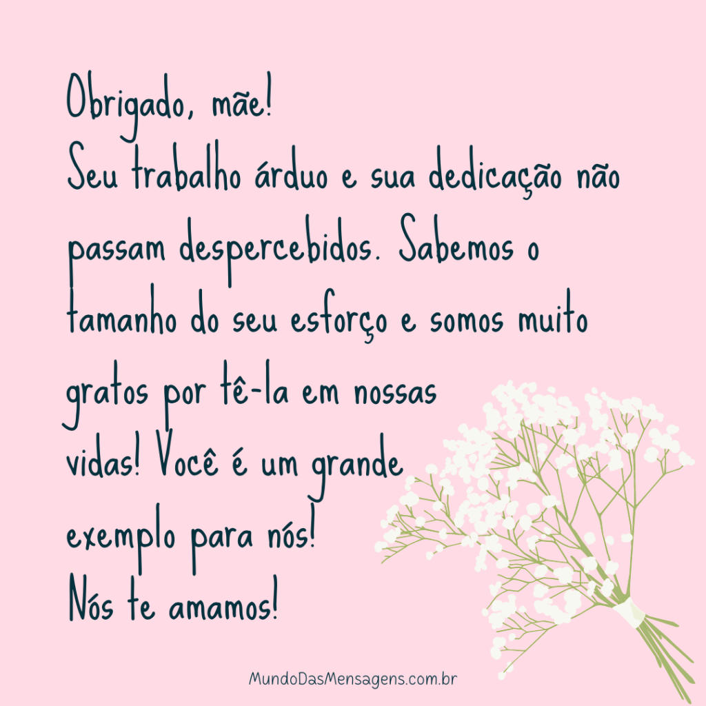 Nós te amamos! Obrigado, mãe! Seu trabalho árduo e sua dedicação não passam despercebidos. Sabemos o tamanho do seu esforço e somos muito gratos por tê-la em nossas vidas! Você é um grande exemplo para nós! Nós te amamos! Compartilhe essa mensagem com alguém especial: Clique para compartilhar no WhatsApp(abre em nova janela) WhatsApp Clique para compartilhar no Facebook(abre em nova janela) Facebook Clique para compartilhar no X(abre em nova janela) 18+ Clique para compartilhar no Pinterest(abre em nova janela) Pinterest Clique para compartilhar no Telegram(abre em nova janela) Telegram Clique para compartilhar no LinkedIn(abre em nova janela) LinkedIn Clique para compartilhar no Tumblr(abre em nova janela) Tumblr Clique para enviar um link por e-mail para um amigo(abre em nova janela) E-mail Clique para imprimir(abre em nova janela) Imprimir Curtir Carregando... Relacionado