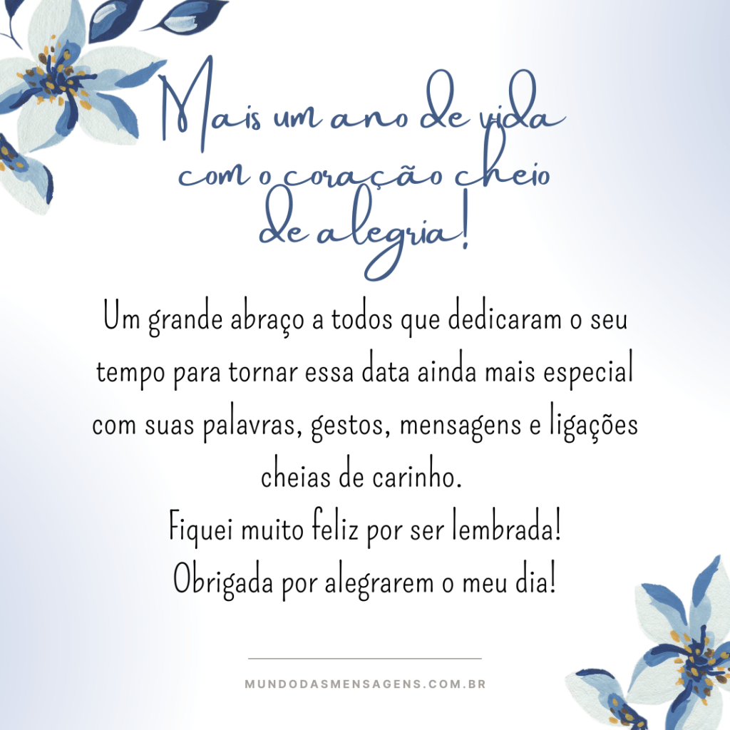 Um grande abraço a todos que dedicaram o seu tempo para tornar essa data ainda mais especial com suas palavras, gestos, mensagens e ligações cheias de carinho.